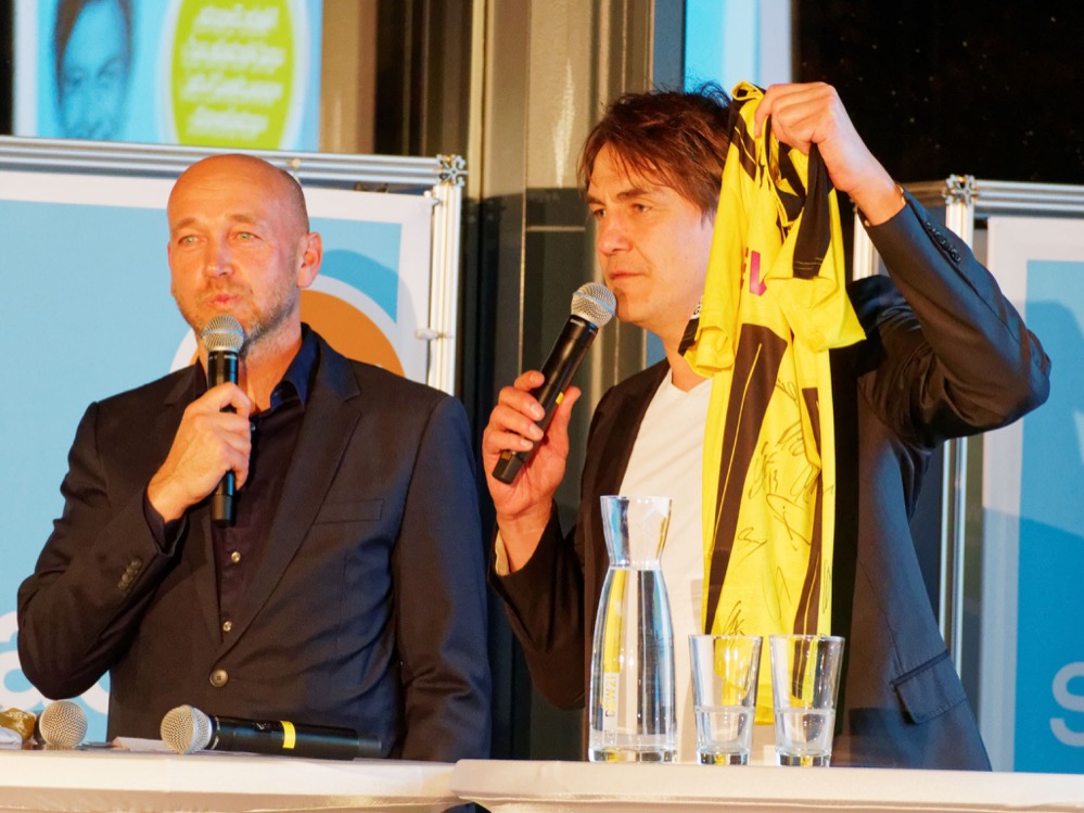 In der Halbzeitpause, als die Stimmung der fast 150 Gäste schon auf einem ersten Höhepunkt war, boten die Unterhalter zu Gunsten von Kinderlachen e.V. ein Trikot der Borussia mit Unterschriften aller Spieler zur Versteigerung an.