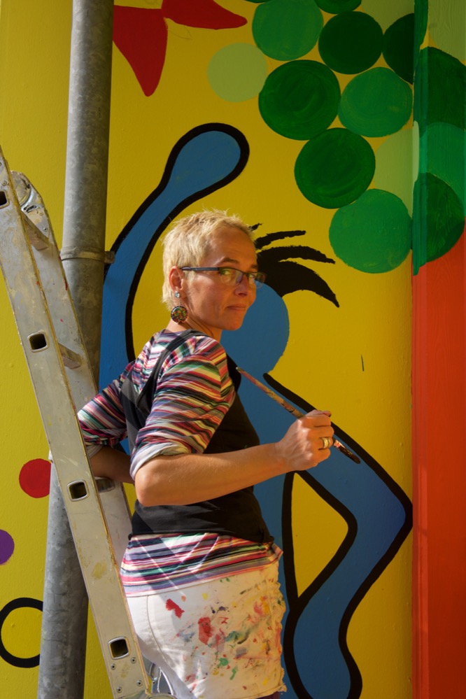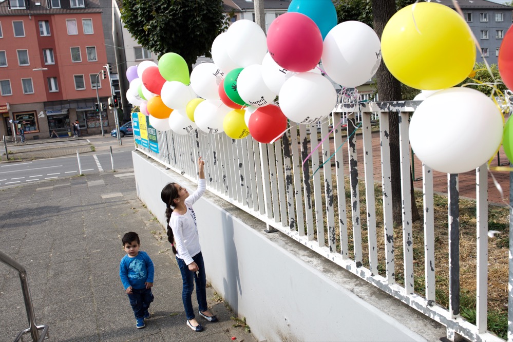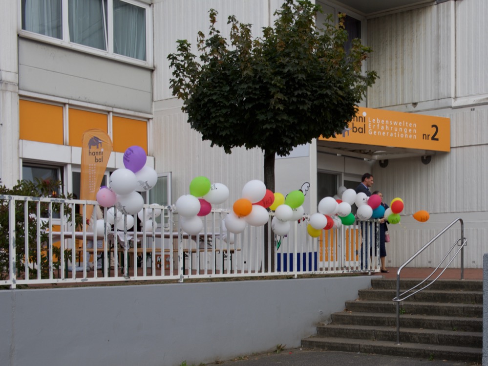 Viele bunte Luftballons mit „Hannibal 2“ begrüßten die zahlreichen BesucherInnen im Hannibal-Komplex an der Jägerstraße 2. In einer Ecke malte die Künstlerin Almut Rybarsch-Tarry noch mit Kindern bunte Figuren und Blumen an die Wand. Alles präsentierte sich bei sonnigem Frühherbstwetter blitzsauber, offen, freundlich.
