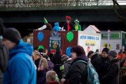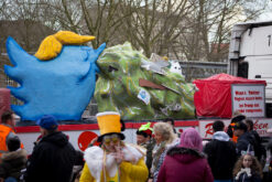 Vom Prinzenwagen mit Dirk III. und Nadja I. flogen später sogar Mettwürstchen und Spülschwämme. Diese außergewöhnlichen Präsente fanden Anklang – vor allem bei den nicht mehr ganz so kleinen Jecken. Mehrere Wagen beschäftigten sich wieder mit politischen Themen. Vor Allem Angela Merkel und Donald Trump wurden aufs Korn genommen.