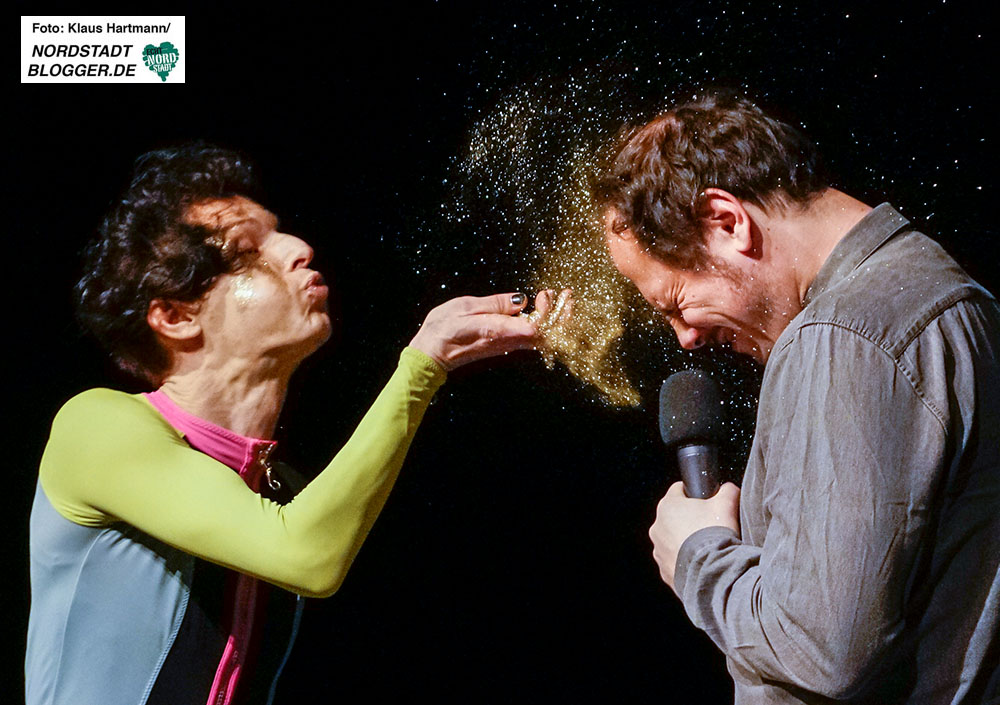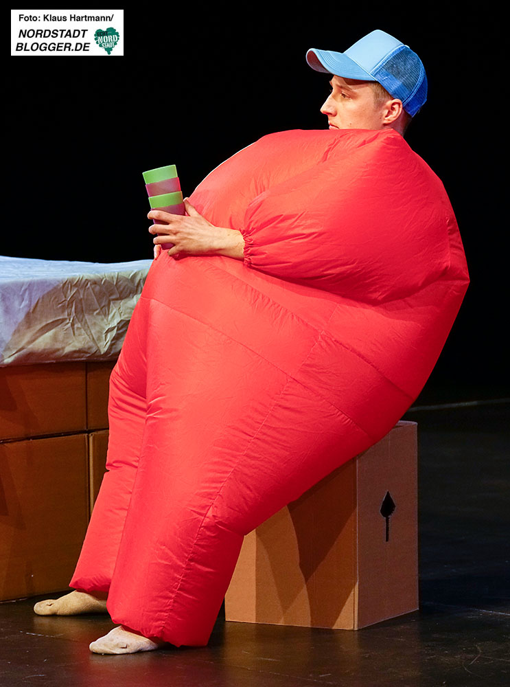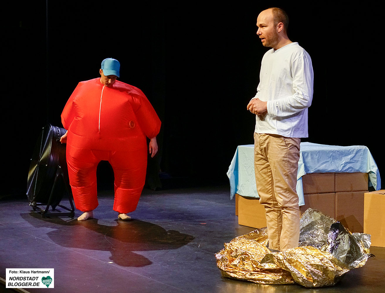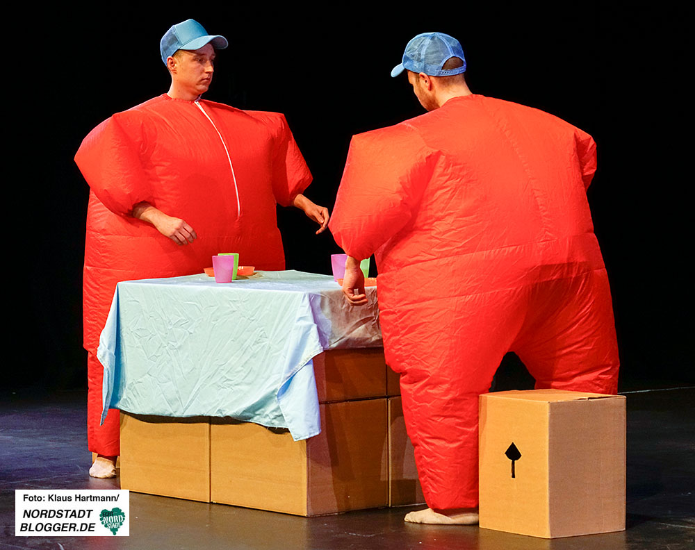 Sehr zum Vergnügen des Publikums torkelten die beiden in aufblasbaren Fat-Suits über die Bühne, sitzen vor sich aufblähenden Tischdecken oder lassen sich mit Hilfe eines Staubsaugers in Folie saugen.