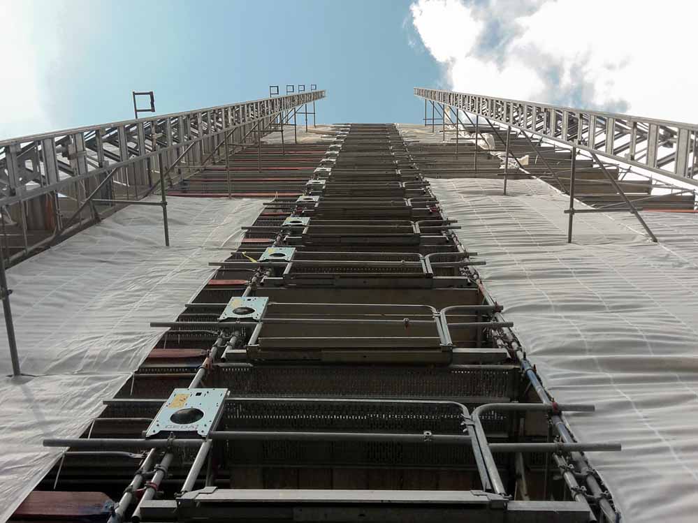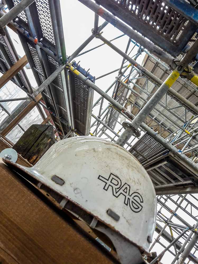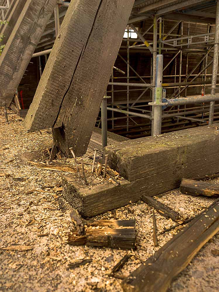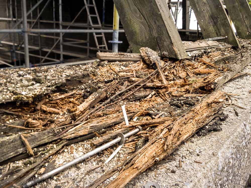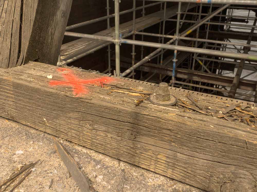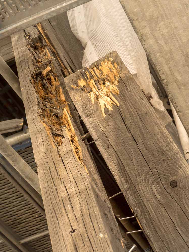 Dazu zählen in erster Linie die Bauteile ganz oben, die umlaufenden Reparaturbalkone und die tragenden Pfosten. Deutlich sind in einigen Bereichen noch die verrotteten Holzteile zu sehen, die auf ihre Auswechslung warten.
