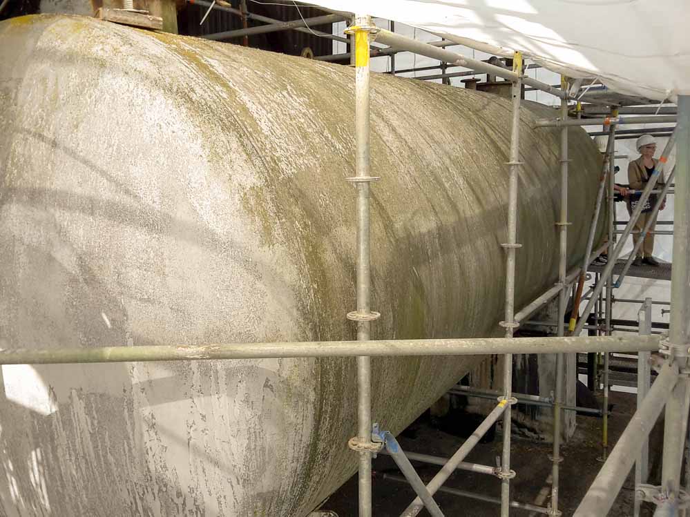 Dabei gehen sie von oben nach unten vor und tauschen, wo es nötig ist, Balken oder Bretter aus. Auch die umlaufenden balkonartigen Wartungsgänge bedürfen einer Grunderneuerung nach historischem Vorbild.