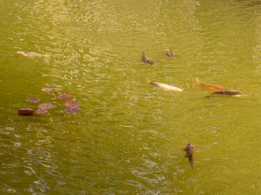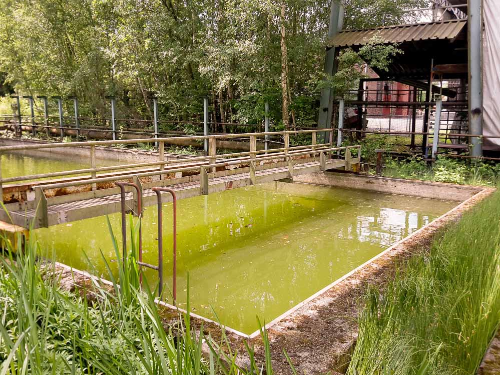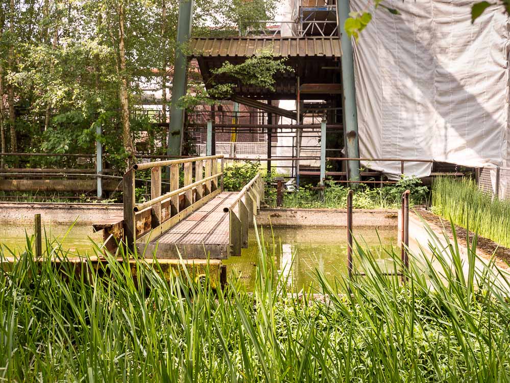 - Das Klärbecken ist jetzt eines großes Wasserbiotop, große Goldfische und mächtige Kois bewohnen heute zwischen Seerosen und anderen Wasserpflanzen den künstlichen Teich mit seinem maroden Industriecharme