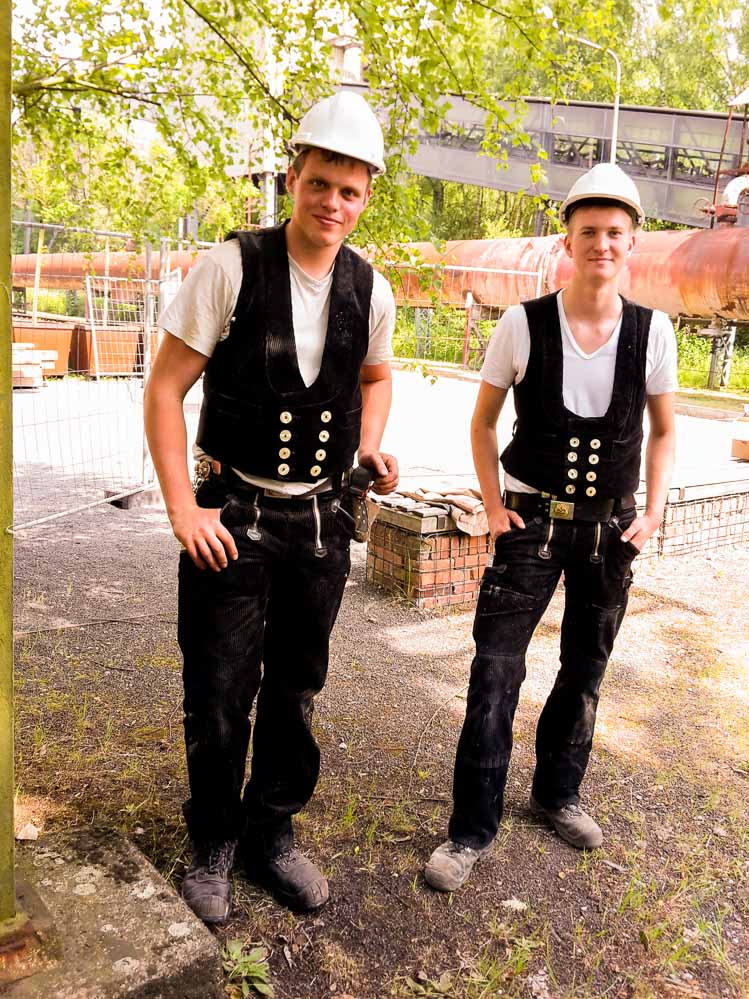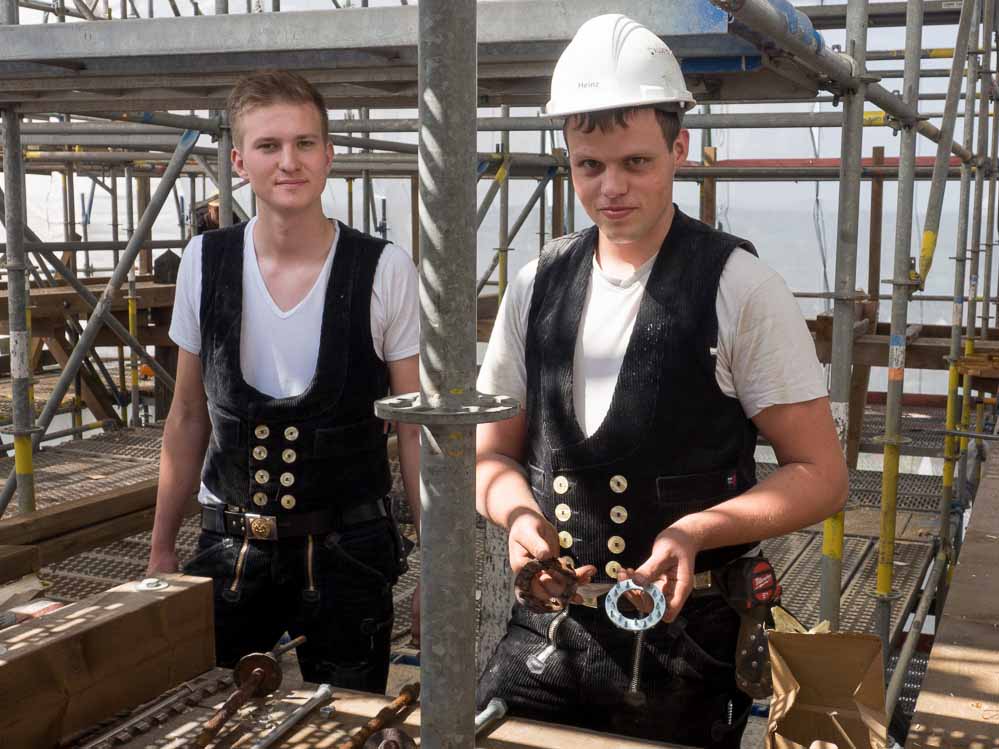 Gemeinsam mit dem 17jährigen Auszubildenden Johannes Lösing führt er die BesucherInnen auf den Turm und erklärt die Arbeiten.