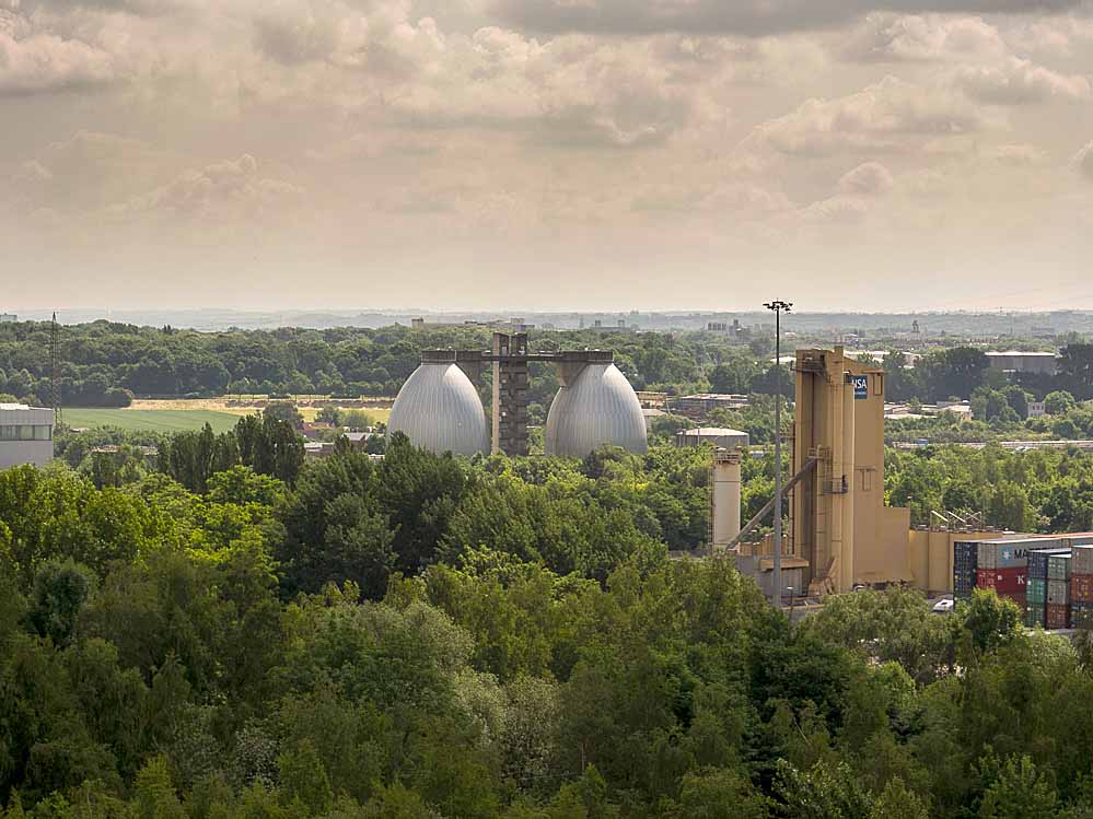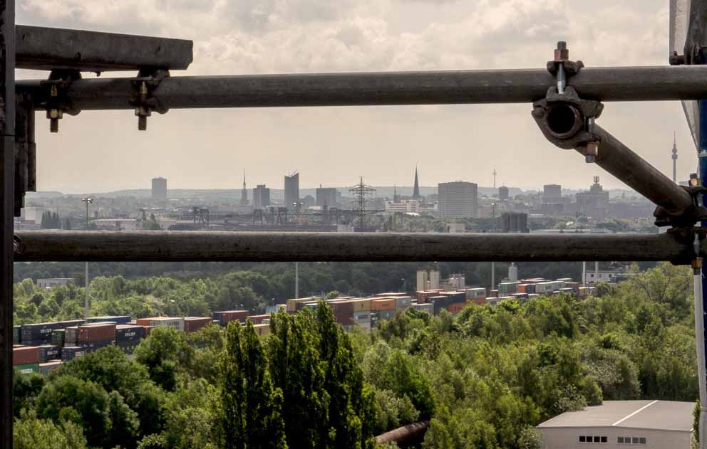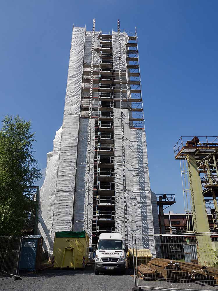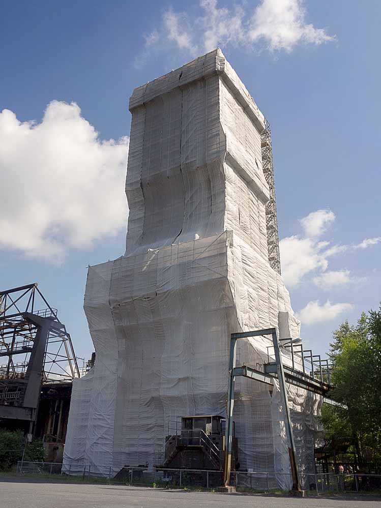 Nein, es ist keine Skultpur vom Verpackungskünstler Christo, die dort in Huckarde steht. Auch wenn es nicht weniger kunstvoll aussieht, diese Verpackung hat einen ganz banalen Grund. Der große südliche Kokslöschturm 0 auf der Kokerei Hansa wird einer umfassenden Sanierung unterzogen.