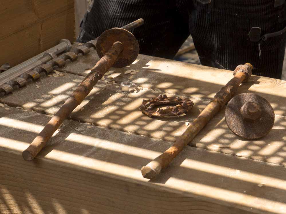 Diese liegen zwischen den Balken und verhindern ein Verschieben und Versetzen. Bolzen und Schrauben allein reichen da nicht, da sich das Holz mehr bewegt und je nach Witterung Größe und Form etwas verändert. „Und um an diese Dübel zu gelangen muss die Konstruktion komplett auseinander genommen werden“.