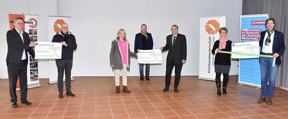 Einen Spendenscheck über je 5.000 Euro erhielten jetzt gleich drei Projekte aus Dortmund und Lünen von der Kreishandwerkerschaft Dortmund und Lünen. Die Dachorganisation des regionalen Handwerks mit ihren 22 Innungen hatte das Geld zum Jahresende zusammengelegt, um in schwierigen Zeiten Initiativen aus der Region zu fördern. „Die Gelder waren eigentlich für Versammlungen, Feste und Freisprechungsfeiern im Jahr 2020 vorgesehen“, erklärt Kreishandwerksmeister Dipl.-Ing Christian Sprenger. „Da diese nicht stattfinden konnten, haben sich Innungen und Kreishandwerkerschaft gemeinsam dazu entschlossen, das Geld zu spenden.“ Dabei kam die bedeutende Summe von insgesamt 15.000 Euro zusammen. Die drei Schecks, die am Dienstag von Kreishandwerksmeister Christian Sprenger, dem Lüner Stadthandwerksmeister Christoph Haumann sowie Hauptgeschäftsführer Joachim Susewind im Ausbildungszentrum des Handwerks an der Langen Reihe in Dortmund-Körne überreicht wurden, gehen