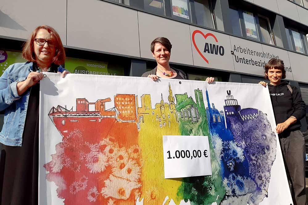 Die Geschichte zu der Spende nahm ihren Anfang bereits Ende 2020. In diesen schwierigen Zeiten der Pandemie wollte die AWO Dortmund mit einer „Mutmach-Postkarte“ Kontakt zu all ihren Ehrenamtlichen halten. Auf der Suche nach einem geeigneten Motiv war der Wohlfahrtsverband auf ein wunderbares Bild von Susanne Hildebrandt gestoßen. Diese hatte – in ihrem Beruf in der Koordinierungsstelle für Lesben, Schwule und Transidente arbeitend – sich in ihrer Freizeit als Künstlerin betätigt und eine Silhouette der Stadt Dortmund in Regenbogenfarben veröffentlicht. Als Susanne Hildebrandt vom Anliegen der AWO hörte, war sie sofort einverstanden, dass ihr Bild als Motiv zum Mutmachen verwendet werden sollte. Sie lehnte aber jedes Honorar ab und machte der AWO mit ihrem Bild ein großzügiges Geschenk.