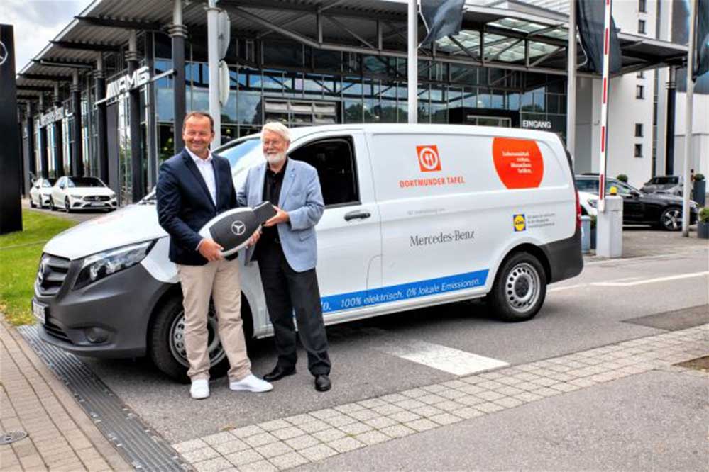 Jede soziale Bewegung braucht einen Motor – ein nagelneuer Mercedes-Benz E-Vito sorgt künftig bei der Dortmunder Tafel für mehr zukunftsorientierte Mobilität. Das Fahrzeug wurde am Donnerstag, 29. Juli 2021, von Georg Abel, Vertriebsdirektor Mercedes-Benz Pkw & Van West, an Dr. Horst Röhr, Vorsitzender der Dortmunder Tafel und Gerd Hewing, Beirat der Dortmunder Tafel übergeben. Bereits seit 1998 unterstützt Mercedes-Benz als einer der Hauptsponsoren die deutschen Tafeln. „Wir sind stolz darauf, ein so bedeutsames Projekt wie die Tafel zu unterstützen und damit etwas Gutes zu tun.“ sagt Georg Abel.
