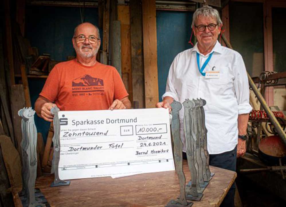 Vor einigen Tagen kündigte der Dortmunder Künstler Bernd Moenikes ein Kunstprojekt zu Gunsten der Dortmunder Tafel an. Der Himmelsgucker, eine Figur aus Cortenstahl, etwa 40 cm groß, sollte in einer Auflage von 100 Stück und zum Preis von 200 €uro an Kunstliebhaber, beziehungsweise Tafelförderer verkauft werden. Moenikes hat die Stahlarbeiten hierzu von der Schlosserei Wittebrock in Brilon ausführen lassen. Diese hat auf ihren Rechnungsbetrag ebenfalls einen großen Nachlass zu Gunsten der Dortmunder Tafel gegeben, so dass diese sich nun, wenige Tage später, über einen Spendeneingang von 10.000 Euro freuen kann, denn eine große Anzahl von Himmelsguckern wurde binnen weniger Tage verkauft. Bernd Moenikes weißt deshalb darauf hin, dass nur noch wenige Exemplar vorhanden sind und Interessenten sich kurzfristig bei ihm melden sollen (Tel: 01703836298). Die Dortmunder Tafel bedankt sich sehr herzlich beim Künstler und der ausführenden Schlosserei für diese Aktion bei der sich 100 Dortmunder und Dortmunderinnen über eine schöne Skulptur freuen können und damit gleichzeitig die Arbeit der Dortmunder Tafel unterstützen.