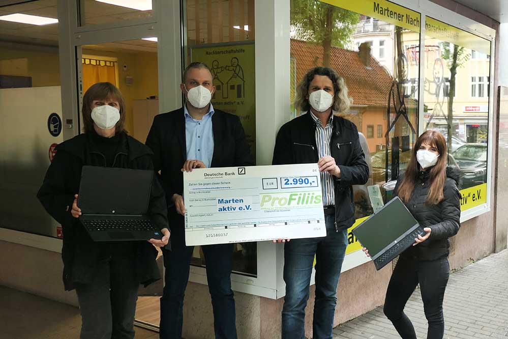Dank der BVB-Stiftung „Leuchte auf“ und der Stiftung „Dein zu Hause hilft“, eine Initi-ative der LEG-Immobilien-Gruppe, wurde der Martener Nachbarschaftstreff geschaf-fen, in dem es eine schnelle und stabile Internetverbindung gibt. ProFiliis – Stiftung zur Förderung von Kindern und Jugendlichen in Dortmund hat die Anschaffung von Note-books finanziert. Ehrenamtliche Kräfte der Nachbarschaftshilfe „Marten aktiv e.V.“ freuen sich Schüler*innen bei technischen und inhaltlichen Fragen zu begleiten.