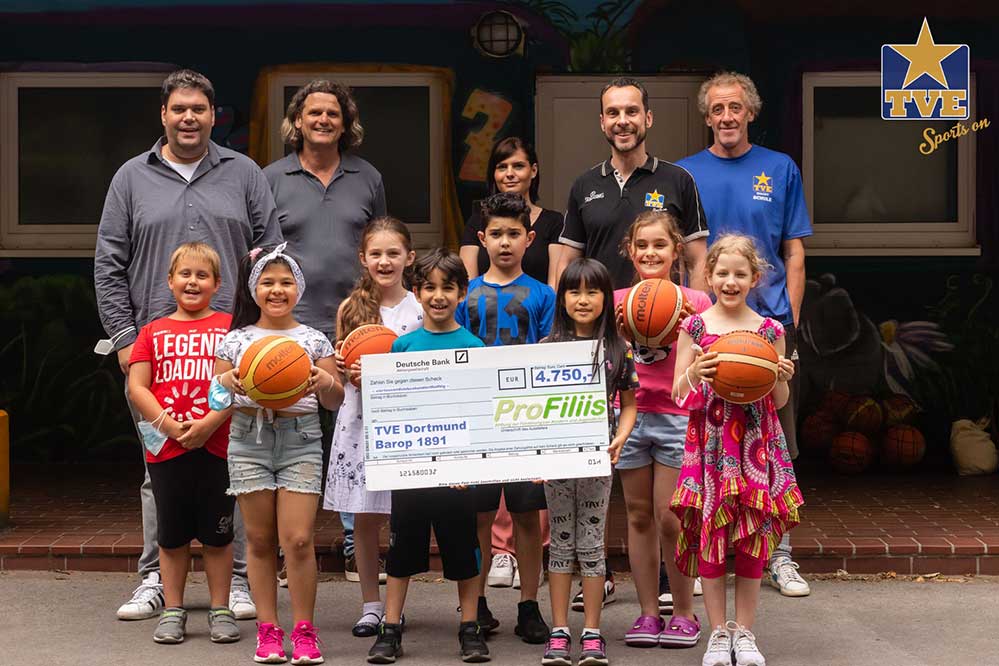 Durch ihre Förderung sichert Pro Filiis den Fortbestand des TVE Projektes „TVE macht Schule“. Im 2. Halbjahr 2020 konnten zudem weitere Schulen als Kooperationspartner gewonnen werden, die gemeinsam mit dem TVE eine Basketball AG initiieren wollen. Die Übergabe des symbolischen Förderschecks an den Verein erfolgte nun an der Petri Grundschule, die gemeinsam mit dem TVE bereits seit einigen Wochen wieder ein tägliches Sportangebot für alle Jahrgangsstufen anbietet. Auch wenn durch die Corona Pandemie bedingt im laufenden Schuljahr noch nicht an allen Kooperationsschulen die Basketball AGs starten konnten, so warten doch alle Schulen und vor allem die