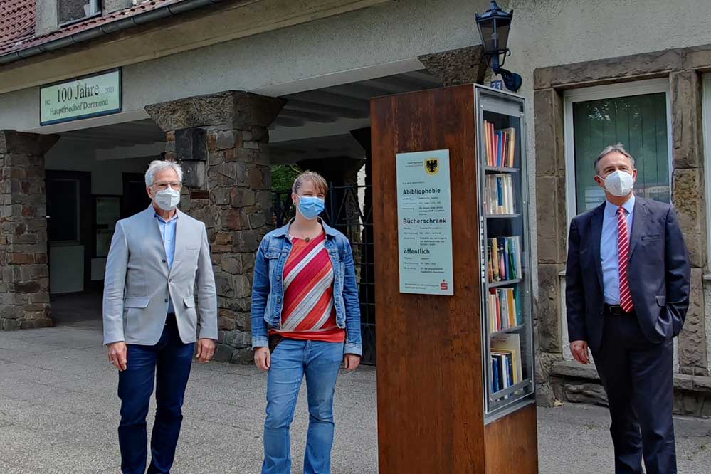 Ermöglicht wurde diese Einrichtung durch eine großzügige Spende in Höhe von 6.000 Euro von der Sparkasse Dortmund. So konnte ein professionelles „Stadtmöbel“ angeschafft werden, ein Bücherschrank aus hochwertigem „Cortenstahl“, der von engagierten Beschäftigten der Friedhöfe Dortmund in Eigenregie aufgestellt und fixiert wurde.