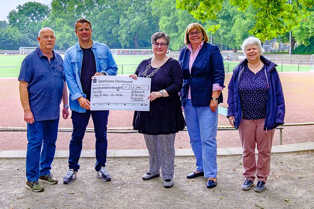 Der Ortstermin im Goystadion beim VfL Hörde zaubert ein breites Lächeln in die Gesichter der Verantwortlichen des Vereins. Einen Scheck über 2.290 € überreicht Sabine Bartz, Vorstandsmitglied der Gemeinwohl-Stiftung der Sparkasse Dortmund dort Anfang August. Damit hat das beim Dortmunder Spendenparlament eingereichte Projekt „Step by Step“ sein Spendenziel erreicht und die Arbeit kann weitergehen.