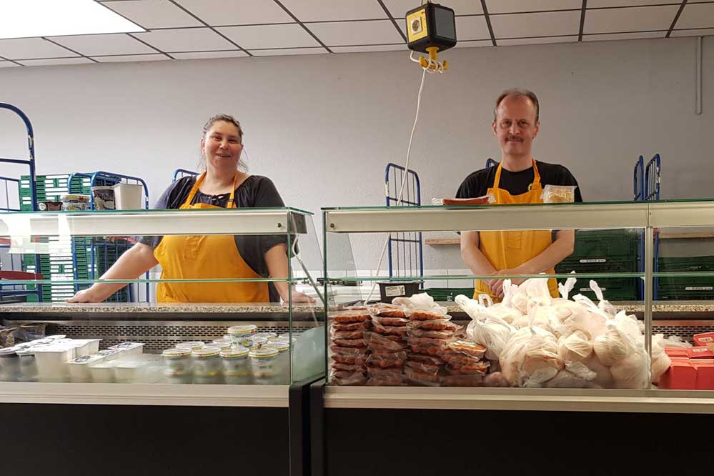 Bildzeile: Andrea Touri und Oliver Heyer, Mitarbeiter aus der Lebensmittelausgabe Haydnstr., hinter den neuen Kühltheken