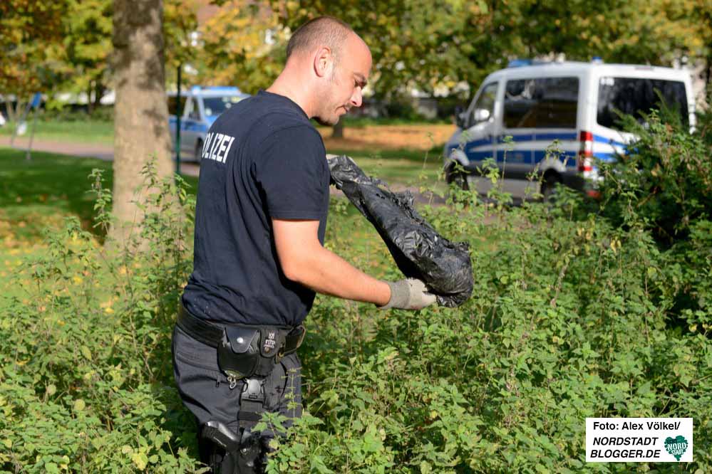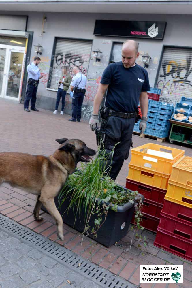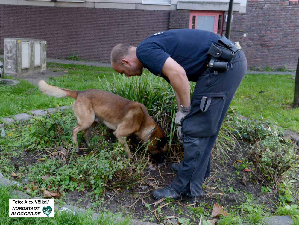 Diensthund „Basco“ avancierte im Laufe der Schwerpunktkontrollen zum größten Feind des Drogenhandels in der Nordstadt. Im Laufe des Vormittages erschnüffelte er sechs Drogenbunker, die Beamten stellten Marihuana und Kokain sicher.