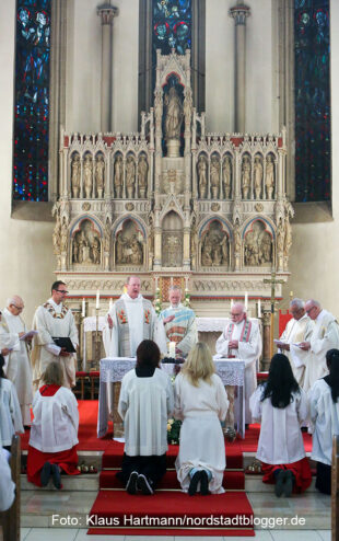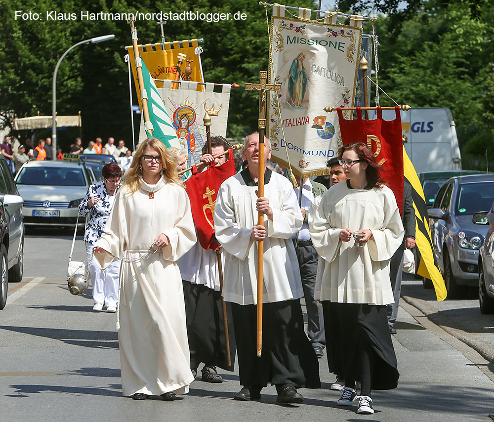 Alle sechs Nordstadt-Gemeinden der katholischen Kirche feierten das Fronleichnam-Fest zusammen mit den Missionen und ausländischen Gruppen in der Kirche. Begonnen wurde mit einem feierlichen Hochamt in der Kirche St. Aposteln in der Clemens-Veltum-Straße. Anschließend führte die Prozession mit mehreren hundert Gläubigen durch die Nordstadt.