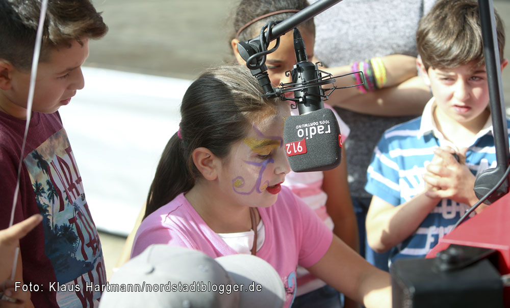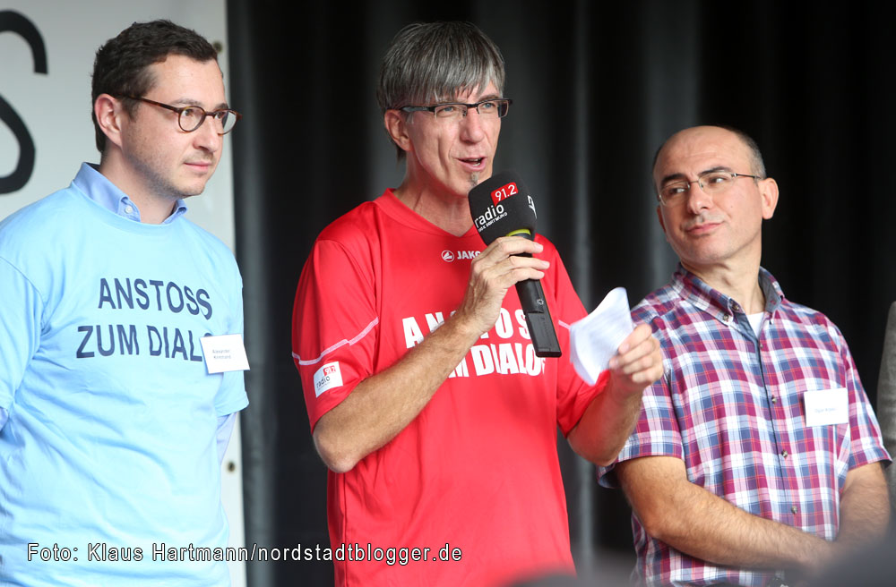 Fußballturnier der Religionen, Anstoß zum Dialog, im Hoeschpark. Vor dem Spiel Pfarrer gegen Imame verlesen Vertreter der Religionen die "Dortmunder Selbstverpflichtung".