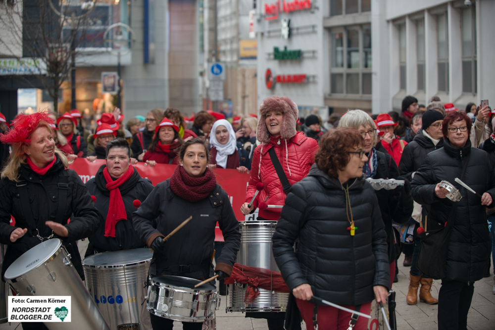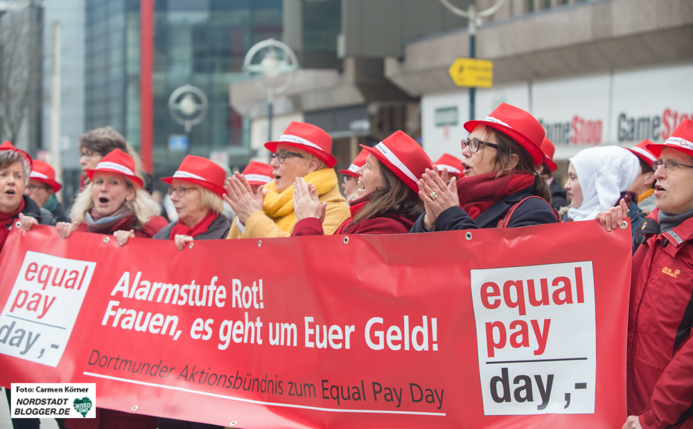 „Gleicher Lohn für gleiche Arbeit“ – am „Equal Pay Day“ – dem Tag für gleiche Bezahlung von Männern und Frauen – gab es einen lautstarken Marsch durch die City von Dortmund. Denn der Lohnunterschied zwischen Frauen und Männern ist heutzutage immer noch bei durchschnittlich 21 Prozent. Das bedeutet: Bis Mitte März eines jeden Jahres arbeiten Frauen quasi unentgeltlich, während die Männer im übertragenen Sinn seit dem 1. Januar bezahlt werden. An diesen „Stichtag“ erinnert die Demo.