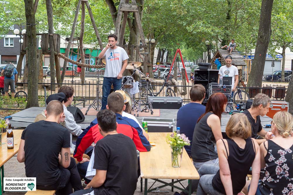 Anschließend wurden sie vom Dortmunder Hafenrapper CERM abgelöst. Sein Unterhaltungsrap mit bewusst zweitklassigen Wortspielen und subtilen Forderungen nach Gerechtigkeit, brachte das Publikum wieder an der ein oder anderen Stelle zum Schmunzeln.