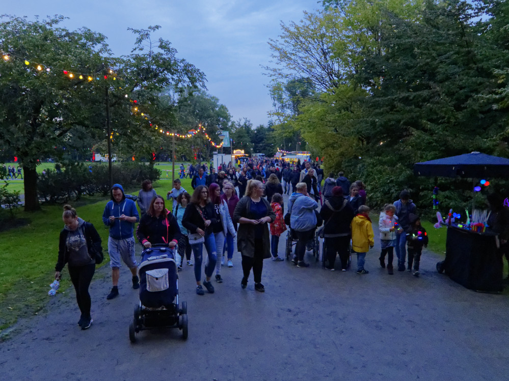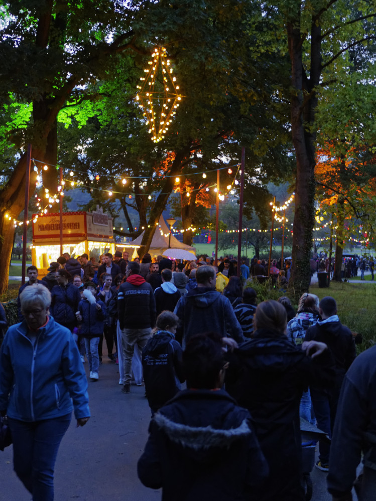 Manch enttäuschte Miene war beim Lichterfest im Fredenbaum zu sehen. Der Wettergott hatte es wohl nicht besonders gut gemeint mit dieser großen Veranstaltung. Tagelanger Dauerregen hatte die große Wiese im Park durchnässt, die Wege standen voller zum Teil tiefer Pfützen. Doch am Abend hatte das Wetter ein Einsehen – zumindest von oben blieb es trocken.