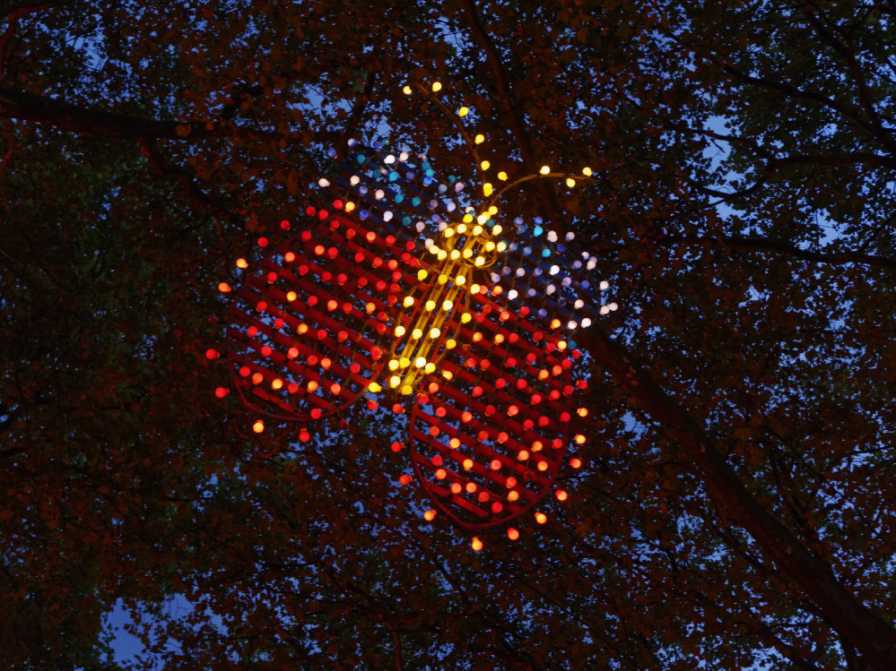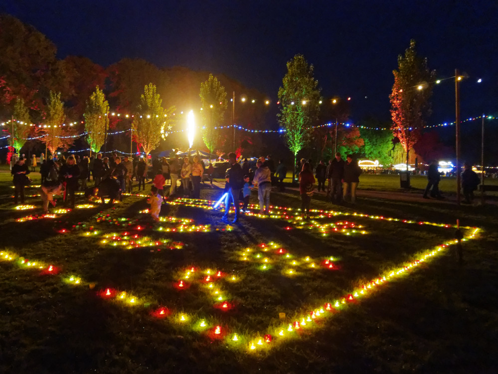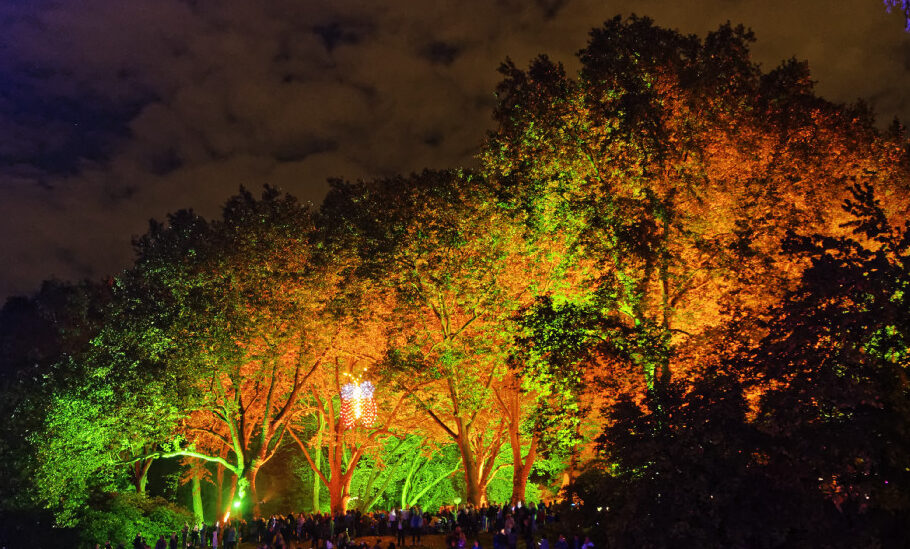 Mit einsetzender Dunkelheit zeigte sich dann auch die liebevolle Lichtgestaltung des Parks. Rund um die große Wiese waren die Bäume in verschiedenen Farben beleuchtet, ein großes Wiesenbild aus bunten Kerzen neben dem Musikpavillon lud viele BesucherInnen zum Schauen und Verweilen ein.