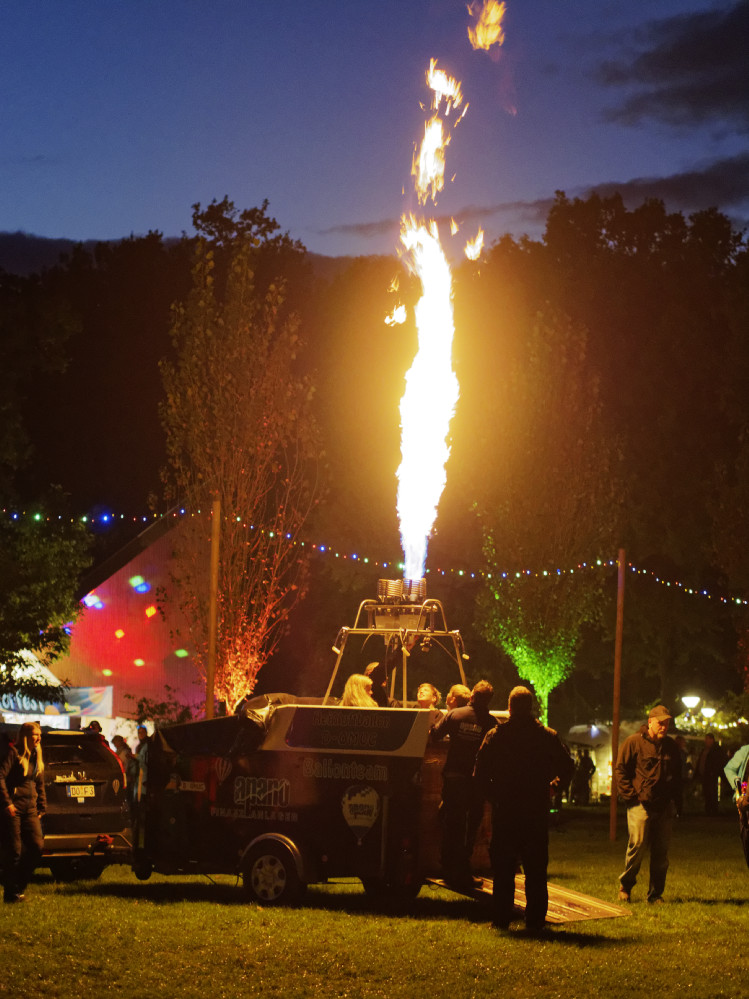 Allerdings zu spät für die geplante Show der Heißluftballons: Das beliebte Nachtglühen musste leider ausfallen. Lediglich eine „Kerze“, wie die Ballonfahrer die nackte Flamme aus dem Brenner nennen, erleuchtete ab und zu das Feld. „Die Wiese ist so nass, dass wir die Ballonhülle nicht auslegen können. Die würde selbst so nass und schwer werden dass wir sie nicht mehr aufblasen könnten. Sauber und trocken bekämen wir sie danach dann auch nicht“ erzählt uns Dirk Herrmann, der Pilot des Ballonteams Apano am Brenner.