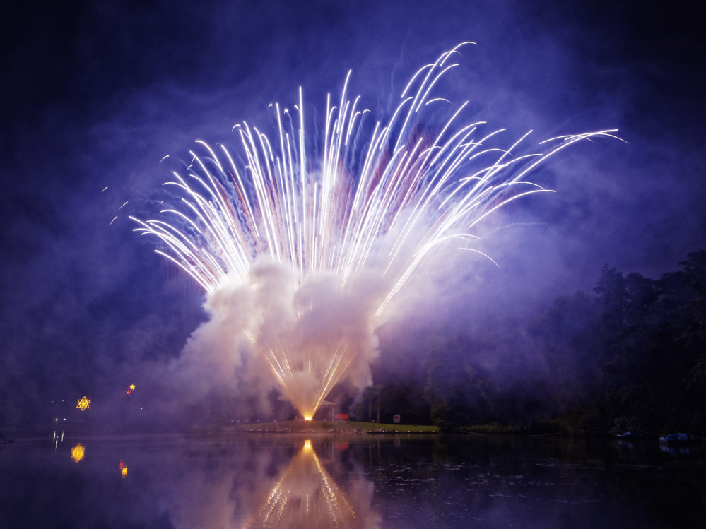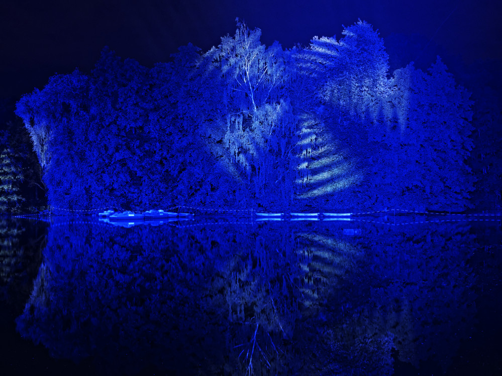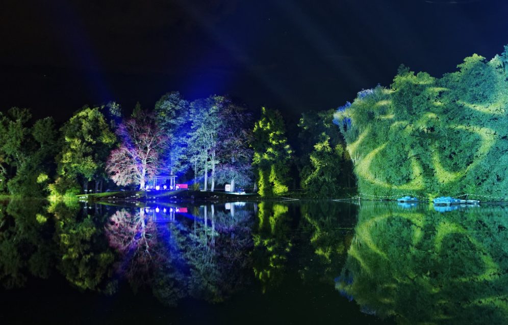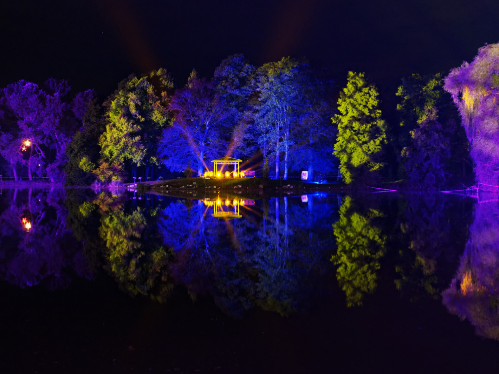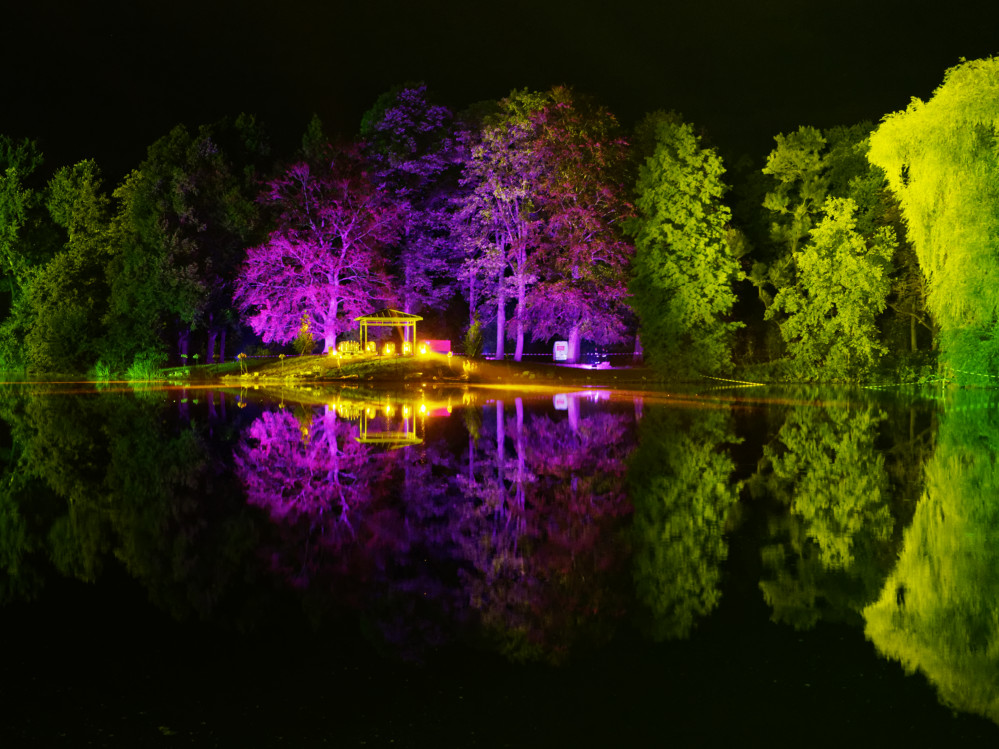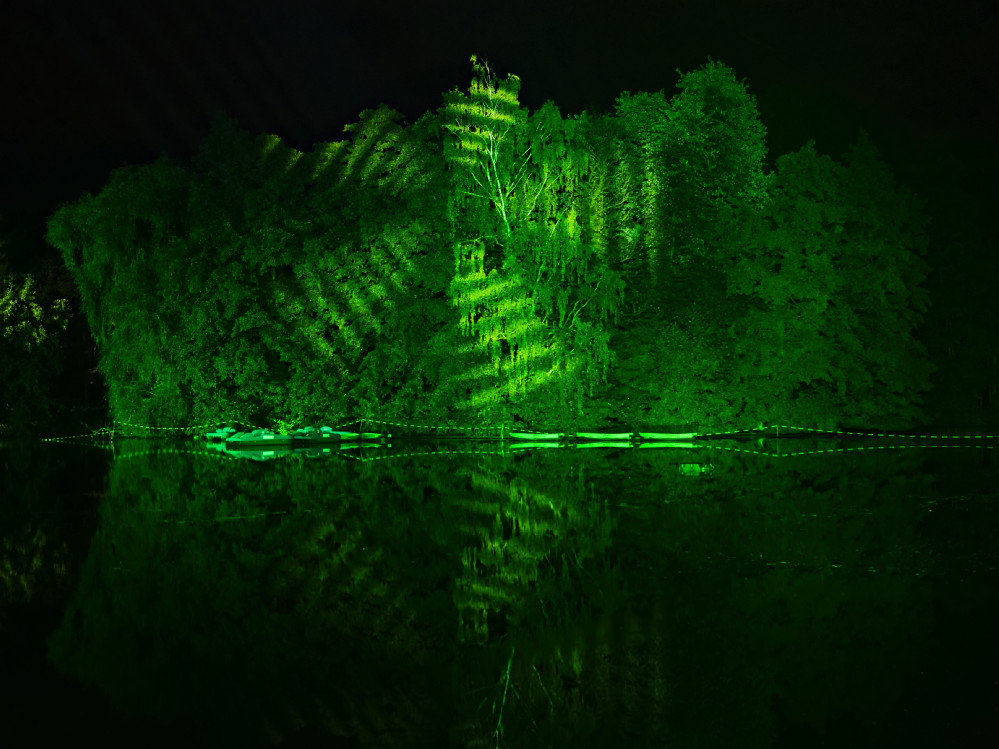 Die Baumkulissen rund um den großen See wurden in diesem Jahr von riesigen Gobo-Projektoren mit bewegten Mustern verziert, während von der Pavillon-Halbinsel gegenüber dem Bootsverleih farbwechselnde Scheinwerfer große Lichtlanzen übern See und in den Himmel strahlten.