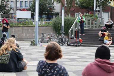Gegen 14.15 Uhr waren die Vorbereitungen abgeschlossen. Am „Platz der Alten Synagoge“ ertönte plötzlich der Song „No Planet B“ von der Waveland Gang. Gespickt mit Zeilen wie „Komm, wir fahren zum Atlantik / Plastiktüten schwimmen dort im Meer“ und dem aussagekräftigen Titel ist er wie gemacht für die Demonstrant*innen.___STEADY_PAYWALL___