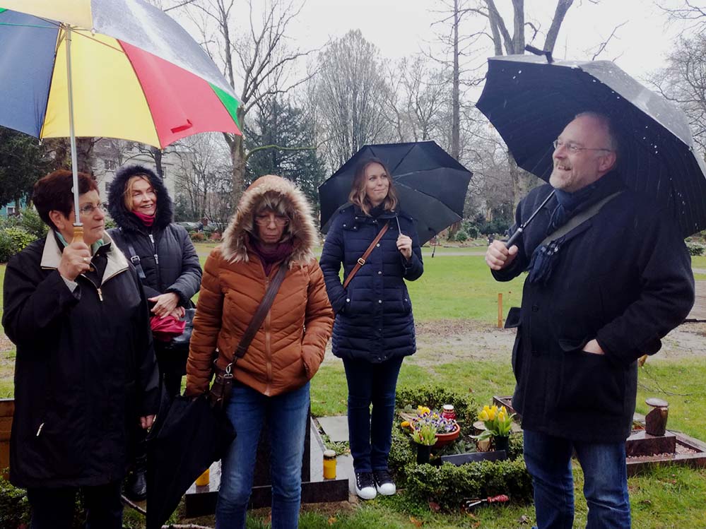 Man hätte den ersten Friedhofsspaziergang 2019 getrost auch „Helden-Tour“ nennen können. Zum Einen ging es um bekannte (Franz Jacoby) und weniger bekannte Dortmunder Helden (Richard Huelsenbeck, Kalle Jürgen Wiersch). Zum anderen waren 14 Wagemutige trotz des heftigen Regens und trotz der Sturmwarnungen zum Dortmunder Südwestfriedhof erschienen, um sich an der Runde zu beteiligen.