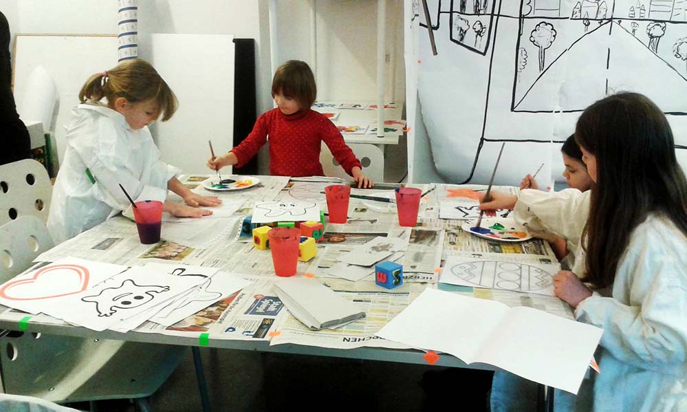 Das Foyer im Erdgeschoss verwandelt sich in eine Malwiese: Eine riesige Papierfläche wartet darauf, verschönert zu werden. Der Medienraum auf der UZWEI dagegen wird zum „Rätselraum“: Jemand hat sich über Nacht hineingeschlichen. Die Besucherinnen und
