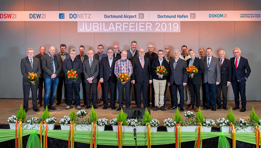 Unter den Gästen im Werkssaal waren Jubilare von DSW21, DEW21, DOKOM21, DONETZ, Dortmund Airport, Dortmund Hafen und von den Wasserwerken Westfalen (WWW). Deren Ehrung nahmen Manfred Kossack, Arbeitsdirektor bei DSW21 und Geschäftsführer bei DEW21, Dirk Wittmann, DEW21-Betriebsratsvorsitzender, und Michael Schneider, DSW21-Betriebsratsvorsitzender, vor.