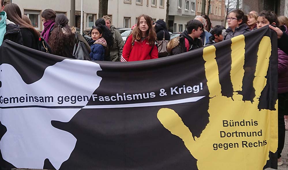 Ende März gingen 40 SchülerInnen der Heinrich-Böll- Gesamtschule und einige ihrer LehrerInnen gemeinsam mit Mitgliedern des „Bündnis Dortmund gegen Rechts“ und BürgerInnen des Martener Forums in Marten auf die Straße, um rechte Aufkleber aus dem Stadtteil zu entfernen.
