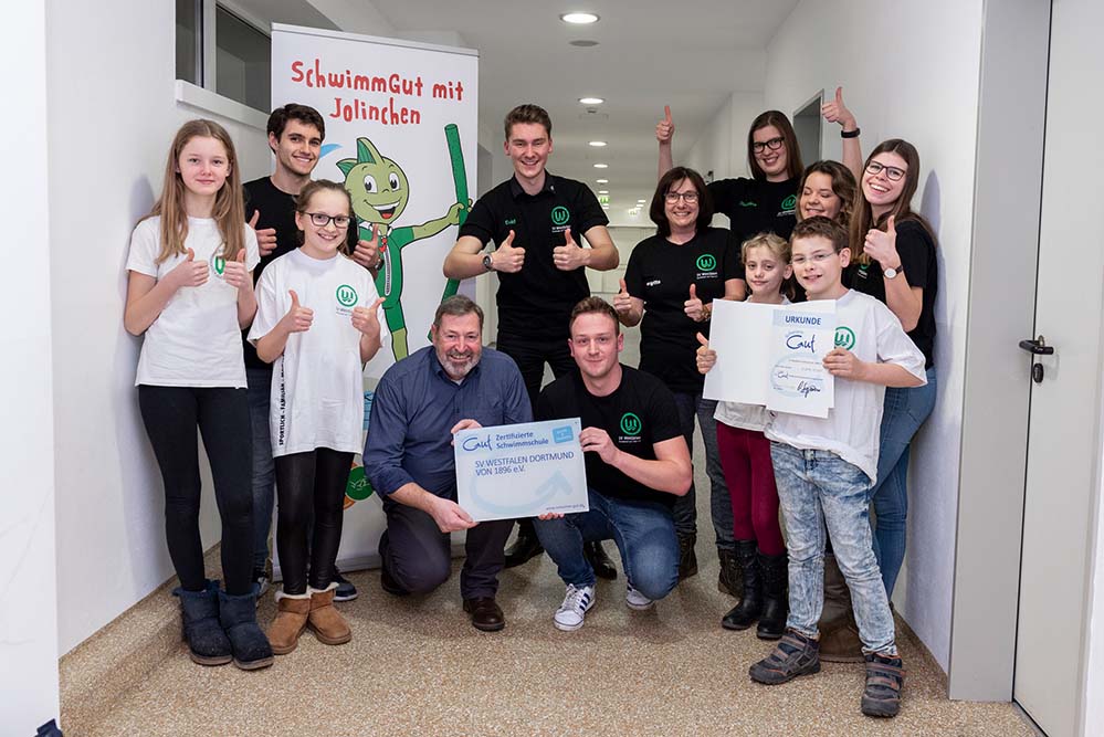 Der SV Westfalen Dortmund wurde für seine vorbildliche Schwimmausbildung mit dem SchwimmGut-Siegel ausgezeichnet. SchwimmGut wurde von den Landesschwimmverbänden initiiert, um die Qualität von Schwimmkursen zu verbessern. Der Schwimmverband NRW besuchte die Vereinsstunde des SV Westfalen Dortmund und bewertete die Qualitätskriterien für erfüllt. Andreas Siepmann vom Schwimmverband NRW übergab die Urkunde an die Übungsleiter des Vereins.