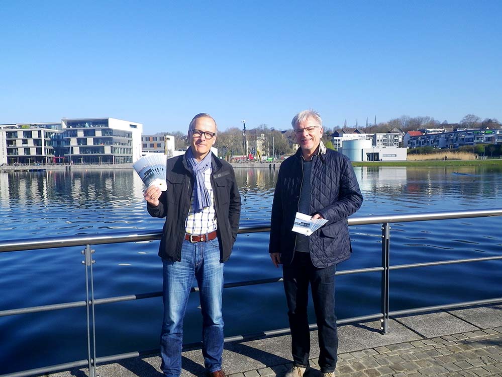 Auf dem Foto sind mit dem neuen Veranstaltungsflyer Georg Sümer und Detlef Rojahn vom Betrieb PHOENIX See zu sehen.
