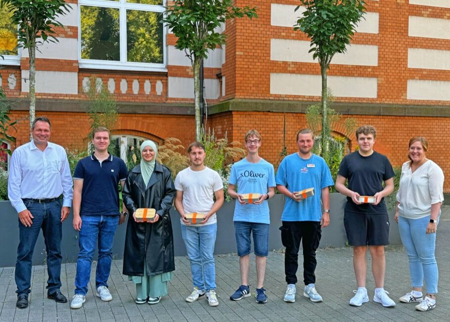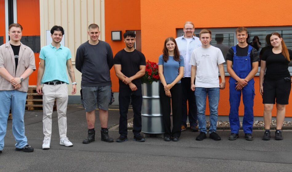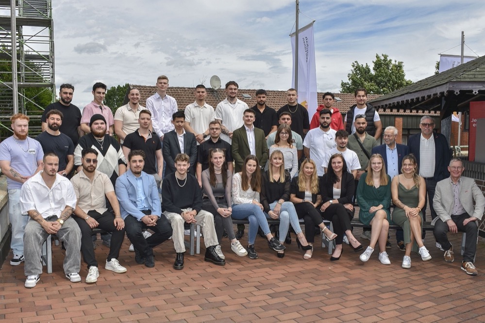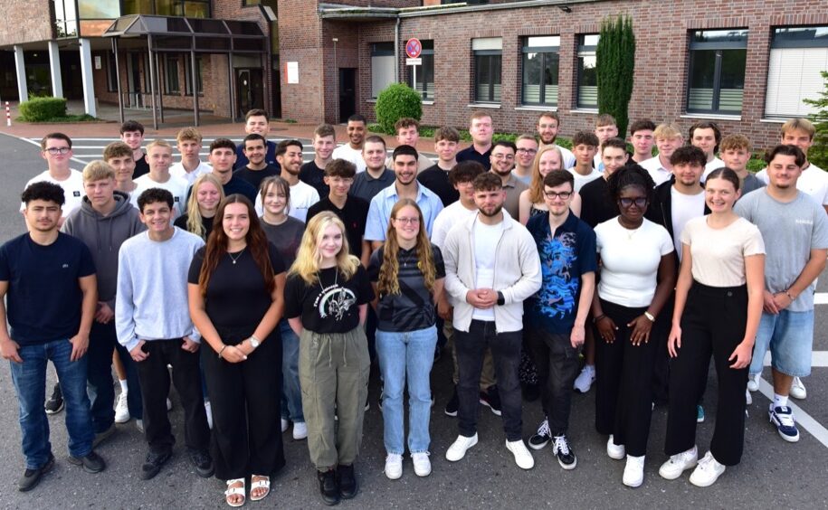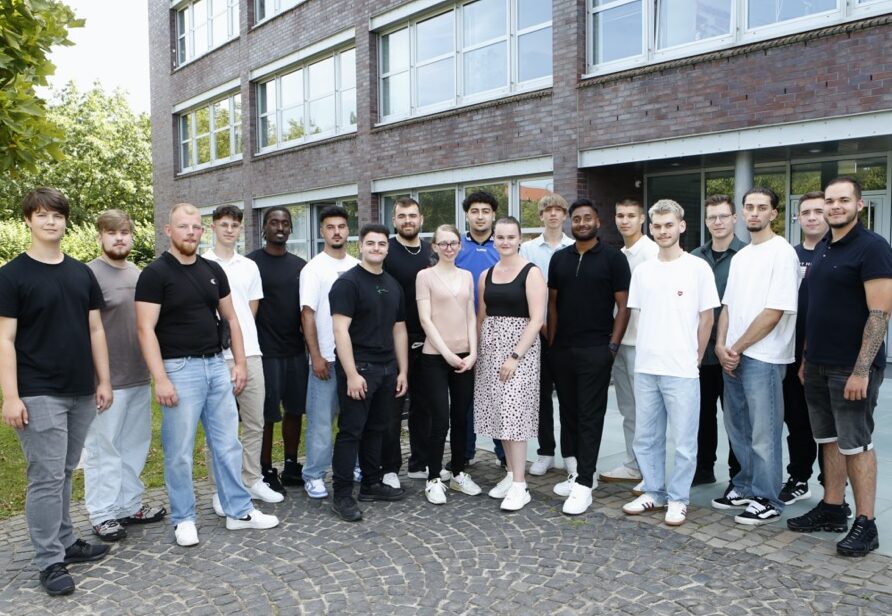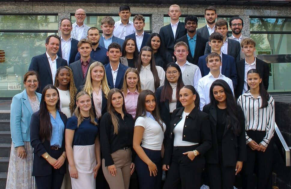 Auf dem Foto von links nach rechts: Simon Schaefer, Fachinformatiker für Daten- und Prozessanalyse, Tom Vethacke, Kfz-Mechatroniker, Glenn Schulz, Berufskraftfahrer DOGA, Justin Focht, Industriekaufmann, Beleza Opondo, Industriemechaniker, Salih Can Memis, Industriekaufmann, Noah Boida, Berufskraftfahrer DOGA, Noah Sanchez Hoff, Umwelttechnologe für Kreislauf- und Abfallwirtschaft, Svenja Gerads, Industriekauffrau DOGA, Mohamed Acachar Boudara, Kaufmann für Spedition und Logistikdienstleistung DOGA, Lea König, Industriekauffrau, David Wolf, Umwelt-technologe für Kreislauf- und Abfallwirtschaft, Ajinthan Vijeyarajah, Industriekaufmann DOGA, Oliver Ader, Geomatiker, Emil Schaffrin, Umwelttechnologe für Kreislauf- und Abfallwirtschaft, Lukas Kaiser, Geomatiker, Caner Sancak, Berufskraftfahrer DOGA, Aleks Mlynarski, Berufskraftfahrer DOGA, Máté Daniel Kiss, Berufskraftfahrer DOGA.