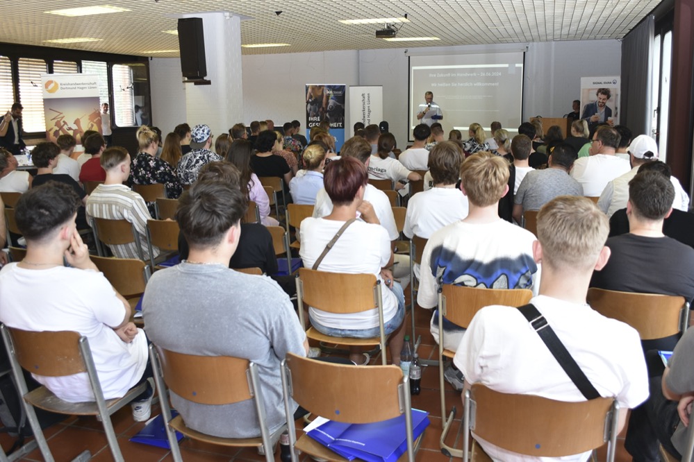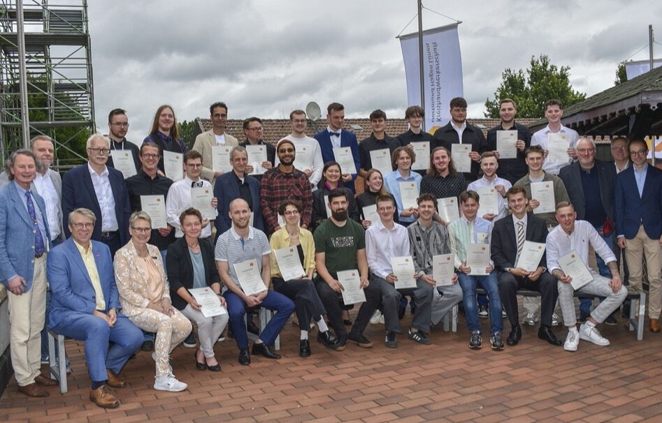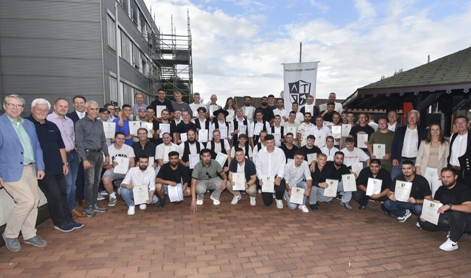 In einer der größten Innungsfestlichkeiten des Jahres haben die Baugewerke ihre Auszubildenden freigesprochen. Insgesamt 87 Absolventinnen und Absolventen der Wintergesellenprüfung 2023/2024 und der Sommergesellenprüfung 2024 wurden offiziell in den Gesellenstand erhoben, darunter 16 Maurer, 20 Fliesenleger, 29 Straßenbauer und 22 Zimmerer. Eingeladen zu der gemeinsamen Freisprechungsfeier hatten die Baugewerbe-Innung Dortmund und Lünen, die Straßen- und Tiefbau-Innung Dortmund und die Stukkateur- und Zimmerer-Innung Dortmund und Lünen. Rund 150 Gäste, darunter auch Eltern und Freunde der neuen Gesellinnen und Gesellen, konnte Lehrlingswart Holger Hülsmann im Dortmunder Ausbildungszentrum Bau begrüßen. Als besonderen Festredner hatten die Innungen Dr. Bernhard Baumann, den Hauptgeschäftsführer des Landesverbands Bauverbände.NRW gewinnen können. Er verwies in seiner Festrede auf die große wirtschaftliche Bedeutung der Bauhandwerke in Nordrhein-Westfalen. „Sie sind die Zukunft unserer Branche. Ohne Sie wird es schwer, die Herausforderungen der Zukunft zu meistern“, so Dr. Baumann. „Egal wohin Sie Ihr beruflicher Weg führen mag, gehen Sie mutig durch alle offenen Türen und ich bin mir sicher, dass Sie viele großartige Dinge schaffen und erleben werden.“ Anschließend folgte die feierliche Freisprechung durch Ausbilder und Zimmermeister Joachim Preuß und die Zeugnisausgabe durch die Vorsitzenden der jeweiligen Gesellenprüfungsaussschüsse. Ein ganz besonderes Lob sowie Urkunden und Förderpreise in Höhe von je 300 Euro konnten dabei die Prüfungsbesten von den Obermeistern der Innungen und den Vorsitzenden der Gesellenprüfungsausschüsse entgegennehmen. Auszeichnungen für die besten Abschlüsse erhielten: Maurer