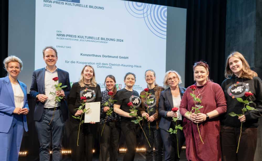 Das Konzerthaus Dortmund ist gemeinsam mit dem Dietrich-Keuning-Haus für sein Community-Music-Programm mit dem Landespreis Kulturelle Bildung 2024 ausgezeichnet worden. Der mit 20.000 Euro dotierte Preis würdigt die herausragende Arbeit beider Einrichtungen im Bereich kultureller Teilhabe für Kinder und Jugendliche. Insgesamt hatten sich rund 80 Projekte um die Auszeichnung beworben, die von einer Fachjury im Auftrag der drei beteiligten Landesministerien für Kultur und Wissenschaft, Schule und Bildung sowie Kinder, Jugend, Familie, Gleichstellung, Flucht und Integration vergeben wurde. Im Zentrum des prämierten Projekts steht unter anderem das Sommerferienangebot, bei dem sich 80 Kinder im Alter von 8 bis 14 Jahren im Dietrich-Keuning-Haus eine Woche lang kreativ entfalten können. Beim gemeinsamen Musizieren, dem Ausprobieren von Instrumenten, Komponieren, Singen, Tanzen und Spielen entdecken sie ihre Ausdrucksmöglichkeiten und stärken ihre sozialen Fähigkeiten. Ziel ist es, Kindern unabhängig von Herkunft oder Vorerfahrung einen offenen Zugang zur Welt der Musik und darstellenden Künste zu ermöglichen. Die Teilnahme ist kostenfrei, inklusive Mittagessen, und erfordert keine Vorkenntnisse. Präsentationen der Arbeitsergebnisse am Ende der Woche geben nicht nur den Kindern Selbstvertrauen, sondern ermöglichen auch den Eltern oft erstmals, ihre Kinder auf der Bühne zu erleben. In diesem Jahr findet das Sommerferien-Projekt vom 14. bis 19. Juli statt, Anmeldungen und Informationen unter eileen.bornkessel@konzerthaus-dortmund.de.