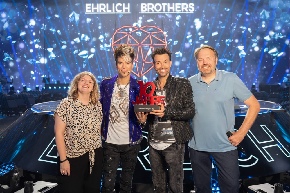 Im Rahmen der finalen Show überreichten Rainer Schüler, Leiter der Westfalenhalle, und Jill Richter, Projektleiterin der Westfalenhalle, den Ehrlich Brothers eine Jubiläumstrophäe als Dank für eine außergewöhnliche Erfolgsgeschichte auf der Dortmunder Bühne.