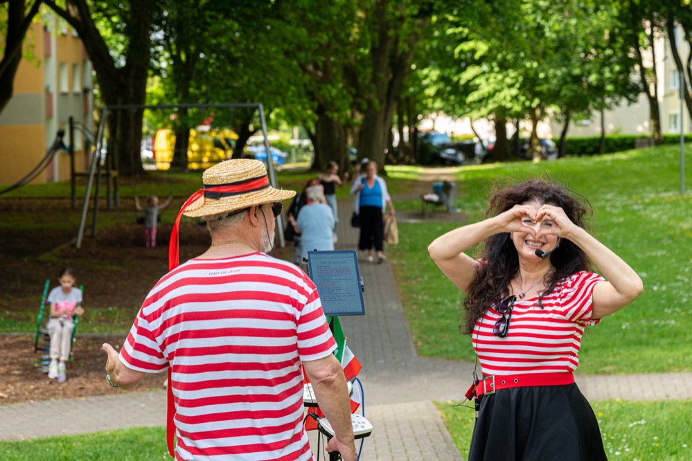 Italienische Musik und strahlende Gesichter prägten das Bild in der Funkturmsiedlung. Das venezianische Duo „I Gondolieri“ brachte La Dolce Vita nach Dortmund und zog mit traditionellen Liedern und auffälligen Kostümen durch das Quartier an der Bredowstraße. Zahlreiche Bewohnerinnen und Bewohner sowie Gäste aus dem Viertel sangen mit, tanzten und genossen gemeinsam einen Nachmittag in sommerlicher Atmosphäre.