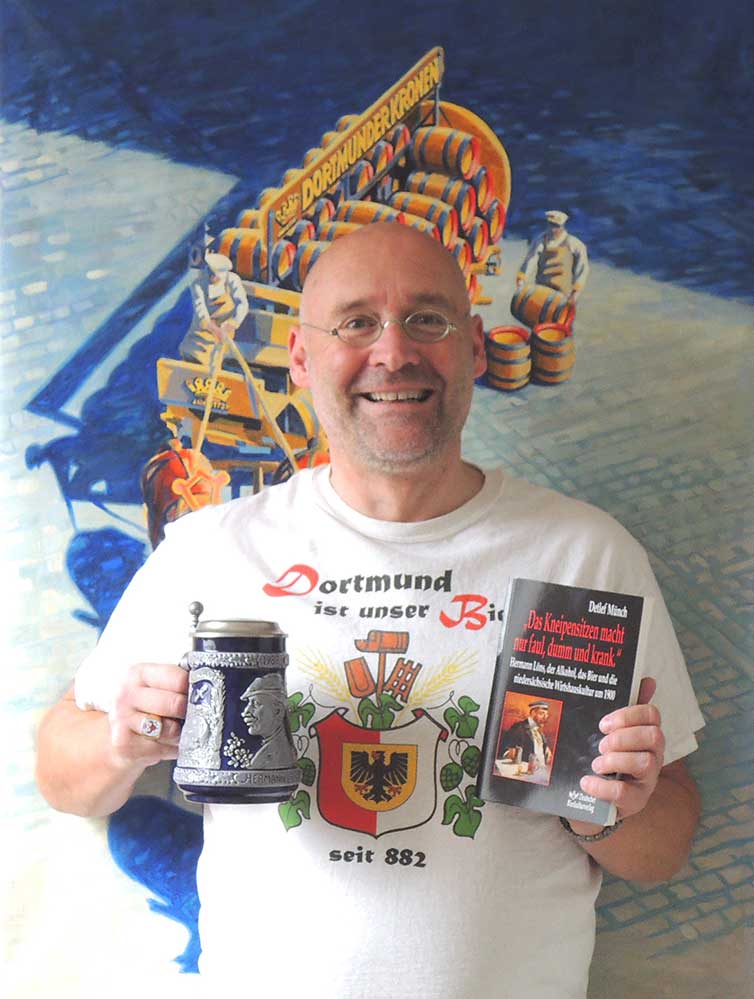 Detlef Münch (auf dem Foto mit Buch und Hermann-Löns-Bierkrug von 1989), gebürtiger Dortmunder, Verleger und Wissenschaftsautor entstammt einer fränkisch-westfälischen Brauereifamilie anno 1710, die bis 1970 auch in der Brauerei von Hövels, Thier & Co exakt 70 Jahre lang als Brauer und Küfer tätig war.