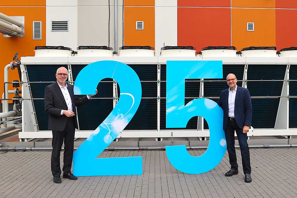 Bildzeile: Als einer der führenden Telekommunikationsdienstleister in der Region kann DOKOM21 seit 25 Jahren auf eine erfolgreiche Entwicklung zurückblicken. Die beiden DOKOM21-Geschäftsführer Jörg Figura (li.) und Franz-Josef Senf freuen sich vor dem Rechenzentrum in Dortmund-Huckarde über das 25-jährige Bestehen von DOKOM21 und begründen bereits zukunftsweisende Kooperationen für die nächsten 25 Jahre.