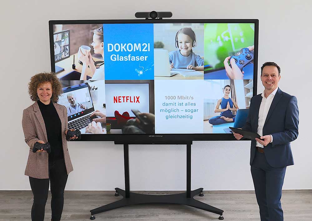Bildzeile: DOKOM21-Marketingleiter Markus Isenburg (re.) und DOKOM21-Marketingmitarbeiterin Helen Waltener freuen sich über die neue Gigabit-Internet-Flatrate, die der regionale Telekommunikationsdienstleister ab sofort anbietet. Ob Homeoffice, Videokonferenzen oder Streamingangebote, Privatkundinnen und Privatkunden in Dortmund und Essen mit einem DOKOM21 Glasfaseranschluss profitieren damit von Highspeed-Internet für zuhause.