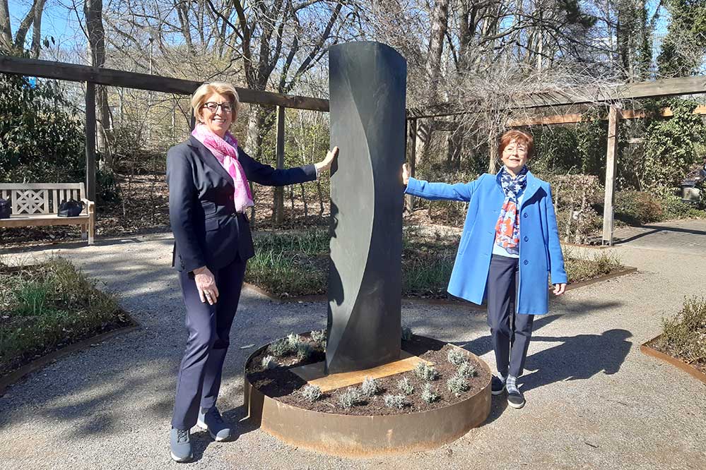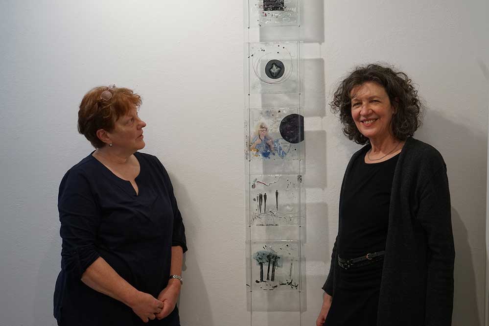 Bildzeile: Koordinatorin Dietlinde Eberts (l.) und Glas-Künstlerin Heide Kemper an der frisch installierten Erinnerungswand.