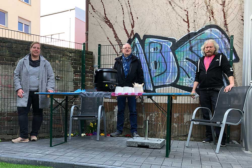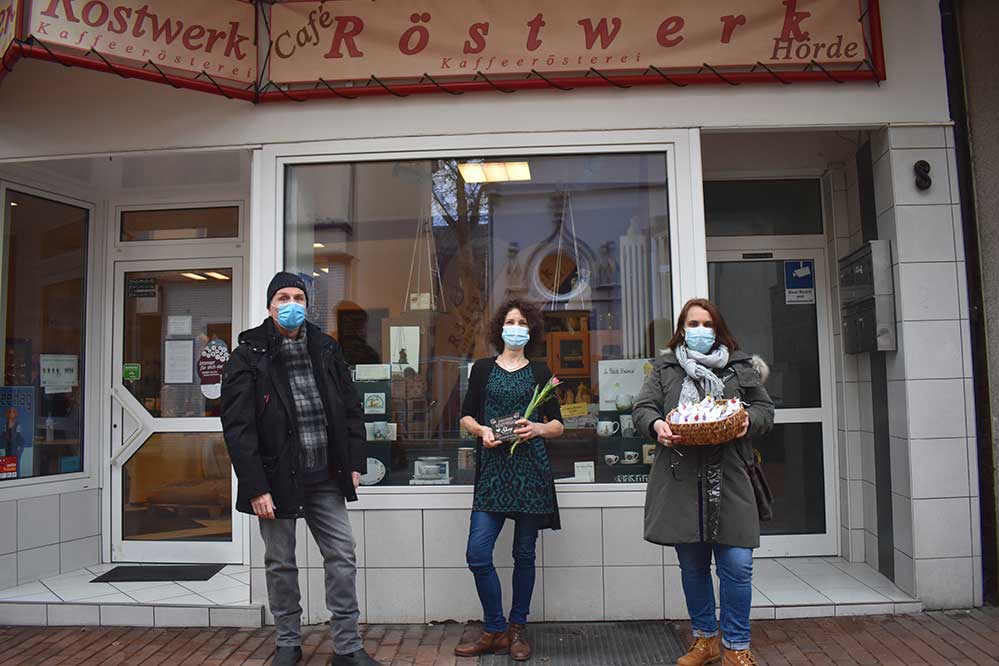 Bildzeile: Susanne Bräuning (Mitte) von der Kaffeerösterei Röstwerk organisierte die Aktion der Initiative „Wir machen AUF…merksam“ zum Weltfrauentag, die Anja Butschkau (r.) und Bernhard Klösel (l.) besuchten.