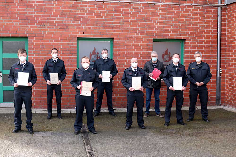 Außerdem wurde Lars Kosbab nach bestandenem Gruppenführerlehrgang am Institut der Feuerwehr NRW in Münster zum Brandmeister befördert. Gleichzeitig konnte er eine Ehrung des VdF NRW für 10 Jahre Dienst in der Feuerwehr entgegennehmen. Benedikt Heitkamp erhielt eine Beförderung zum Oberbrandmeister und Finn Lorenz nahm nach dem Übertritt aus der Jugendfeuerwehr eine Urkunde als Feuerwehrmann entgegen.