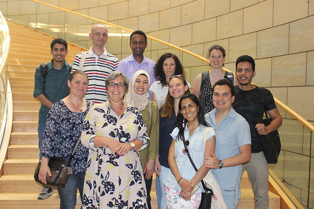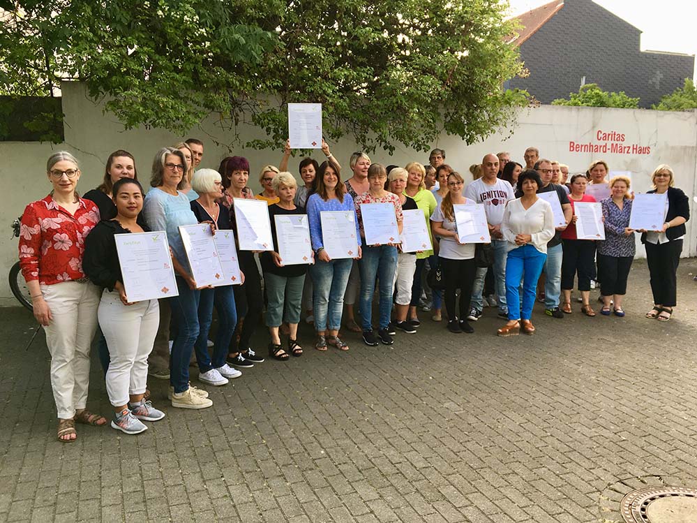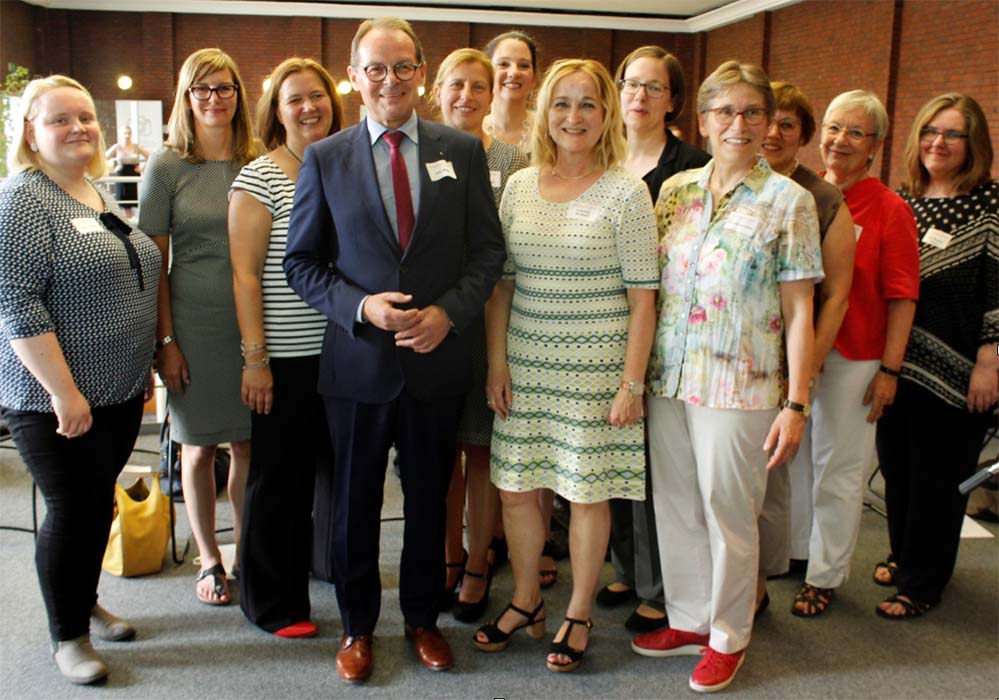 Bildzeile: Mareike Einfeld, 3. von links, Staatskanzlerin des Landes Nordrhein-Westfalen, und die Akteur*innen von Open Globe freuen sich über die Urkunde „Engagement des Monats Juli 2019“