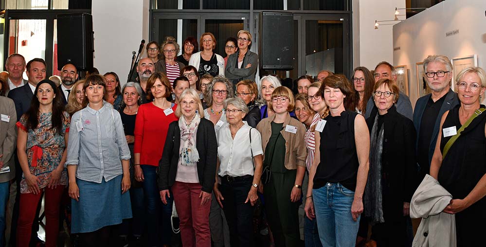 Bildzeile: Martina Raddatz-Nowack (vorne Mitte, Leiterin des Fachbereichs Schule der Stadt Dortmund) und Carsten Schlagwoski, Leiter der Konrad-von-der-Mark-Schule (rechts neben ihr) sowie Schülerinnen und Schüler und weitere Netzwerkpartner.