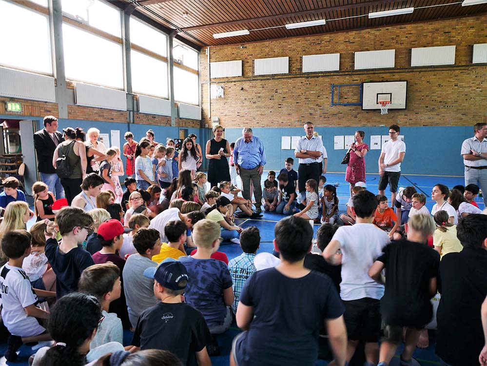 Ende Juni präsentierten die Schüler*innen aller zehn Projektgruppen der vier Grundschulen in der Turnhalle der Petri-Grundschule stolz ihre Ergebnisse aus zwei Jahren Projektarbeit. Unter der thematischen Klammer „Stadt der Zukunft“ wurden die Schüler*innen zunächst spielerisch an ein Grundverständnis für Informatik und Technik herangeführt. In einem nächsten Schritt entdeckten sie die Anwendungen und Zusammenhänge zwischen IT-Lösungen und städtebaulichen sowie sozialen Anforderungen.