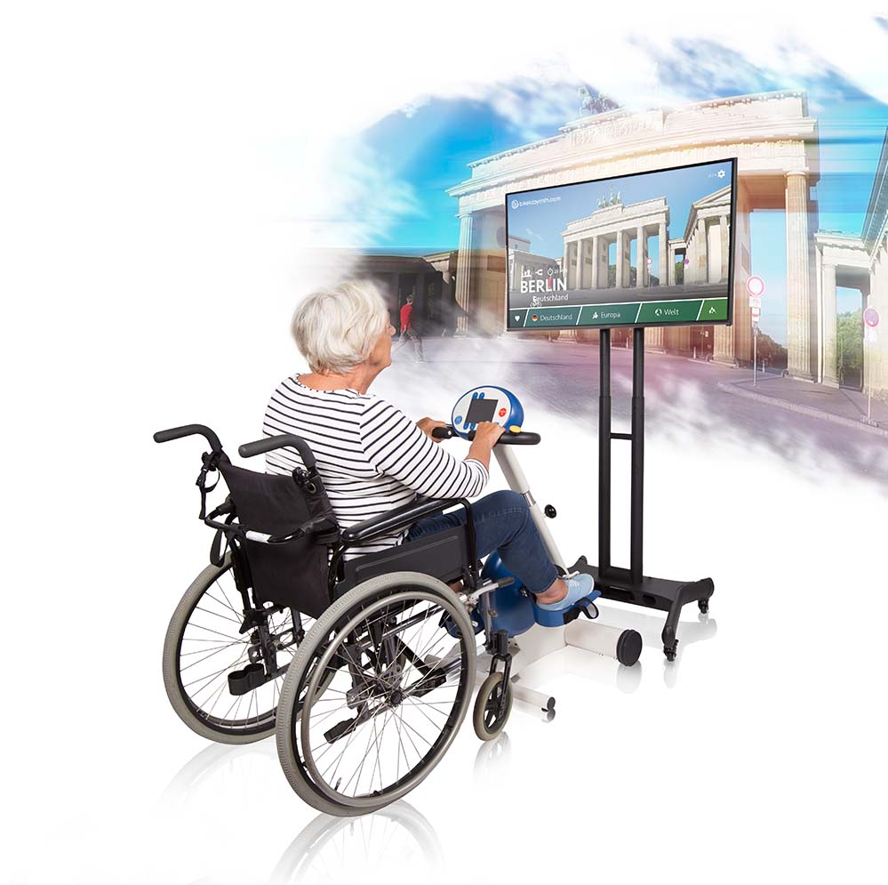 „Digitalisierung birgt im Bereich der Geriatrie ungemeine Möglichkeiten“, sagt Dr. Günther, Oberärztin der Klinik für Geriatrie. „Das Bike-Labyrinth liefert nochmal eine ganz andere Motivation, die Bewegungsübung durchzuhalten und abzuschließen, weil hinter jeder Ecke eine neue Entdeckung wartet.“ Auf diese Weise können Patienten Metropolen, Wahrzeichen und eigens aufgenommene Strecken besuchen: Wenn ein Angehöriger über eine Kamera verfügt, kann er z.B. frühere Spazierstrecken des Patienten abfilmen und per USB-Stick auf das Gerät laden.